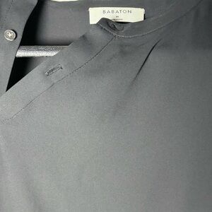 Stylish Babaton blouse in black. Features a unique neckline and flutter sleeves. Ideal for versatile wear.