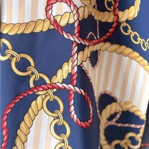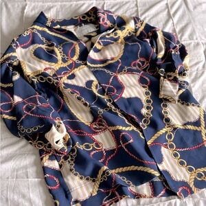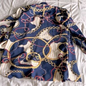 This silky-feel blazer features a bold nautical-inspired chain and rope print in navy, gold, and red with soft beige pinstripes for contrast. The open-front drape and roll-tab sleeves keep it effortlessly chic and easy to layer. Dress it up over a black sheath or throw it on with jeans and heels – it’s a conversation starter either way.