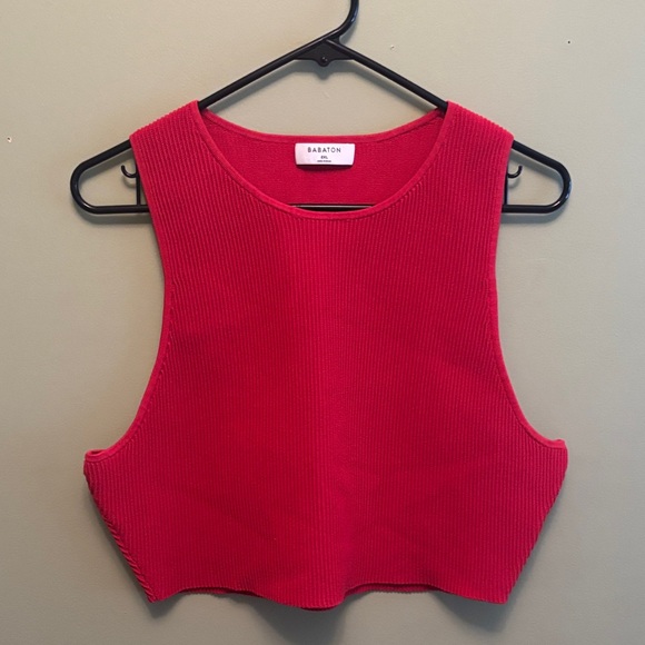 Fitted ribbed knit crop with wide arm openings. Scoop neckline for a clean, modern look. Soft stretch fabric for comfortable wear. Never worn.