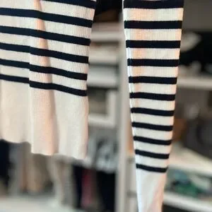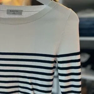 Elegant Babaton knit sweater top from Aritzia. Features ribbed texture, blue stripes, contrasted with a soft white. Worn once. Like new.