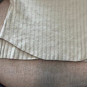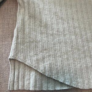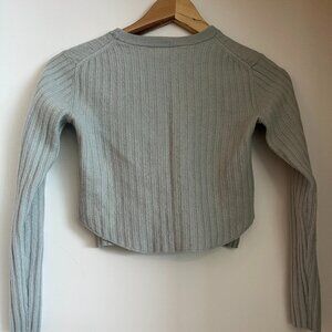 Light sage green in color. Crop sweater. Wool. TINY! It says XSMALL but more like XXSmall. 3/4 sleeve length. Soft. No pilling. Square at the bottom in front and rounded at the bottom in back.
