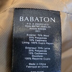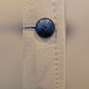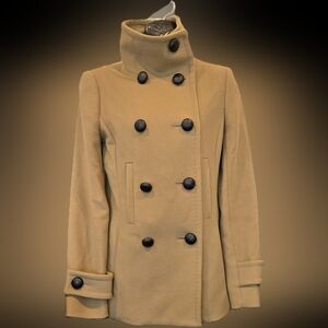 Stay warm and stylish with this elegant tan double-breasted coat. It has faux slit pockets as well as usable Pockets that are satin lined. The high neck can be worn tall or folded over. It is 26 in from shoulder to hem and almost 18 inches pit to pit laying flat, buttoned up. The buttons are Exquisite and have the most adorable detail. The coat is an Italian wool and cashmere blend and is lying throughout, including the sleeves
