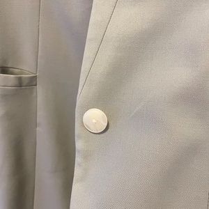 Features include: Inverted notch lapel Metal hook-and-bar closure at front Shoulder pads Back vent and sleeve vents with hidden-button closure Body, sleeves and pockets have a silky stretch lining