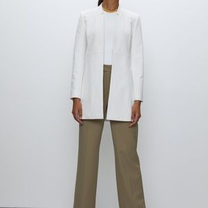 This is a long, minimalist blazer with an open front and an emphasized waist.