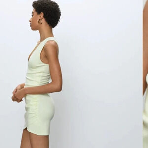 This is a sleeveless bodycon dress with a low V-neckline, an empire bodice and a ruched skirt panel. It's made with smooth, high-stretch fabric that has great shape retention. Stock photo is only to show fit the dress I'm selling is black. Only worn once in excellent condition .
