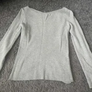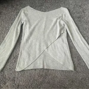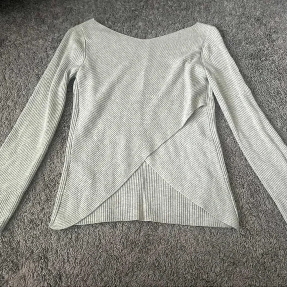 Chic ribbed blouse with asymmetrical hem. Long sleeves and soft fabric. Ideal for versatile styling.