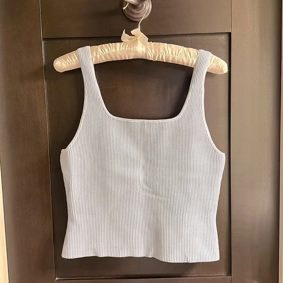 Stylish ribbed crop top. Square neckline. Sleeveless design. Perfect for layering.