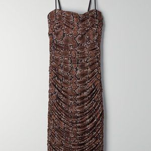 This is a ruched bodycon dress with a square neckline, adjustable straps and a built-in underwire bra. It's made with Babaton's signature Power Mesh, a light mesh fabric that holds you up and in for a flattering, body-shaping effect. This version comes in a snake print pattern that's exclusive to the brand.