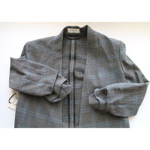 You look like you deserve a raise This is an open-front, shawl collar blazer with rouched and tacked sleeves. This version is made from a yarn-dyed fabric, which means the plaid is woven into the fabric. 3/4 sleeve.