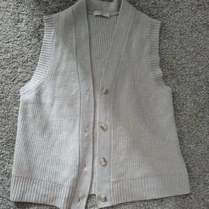This vest is off white in color, 100% Merino Wool with wood colored button details.
