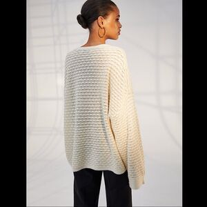 This is an oversized crew-neck sweater with lace-like stitching and subtle metallic detailing. It's knit from a lightweight wool blend from Italy.