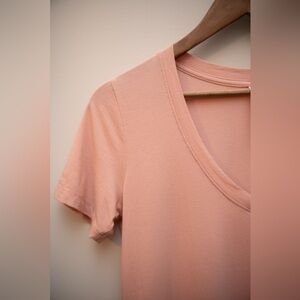 Blush pink V-neck short sleeve tee by The Group Babaton (Aritzia), made in Peru from ultra-soft Peruvian cotton. Lightweight, breathable, and drapes beautifully with a slightly curved hem. A wardrobe staple perfect for layering, lounging, or casual chic looks.
