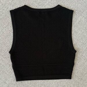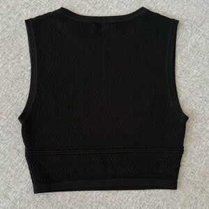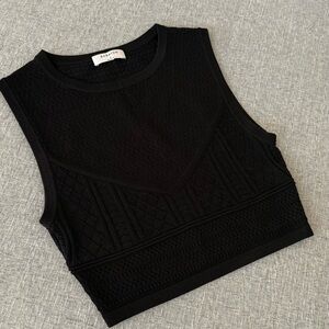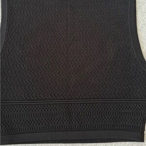 This is a crew-neck sweater tank with fully fashioned construction. It's knit with crepey, all-season yarn. It's constructed using a Pointelle stitch for a delicate look and airy feel.