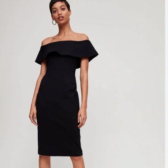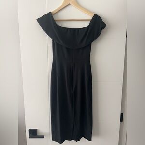 Jersey stretch material. Fitted dress with off the shoulder, zipper back, midi length. Perfect for any semi formal occasion.