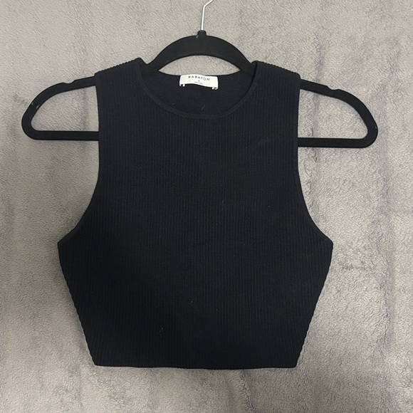 Sleek black ribbed crop top by Babaton. Sleeveless design. Perfect for layering or wearing alone. Great condition, very minor pilling on the inside edges (shown in last picture with tag), always washed according to instructions.