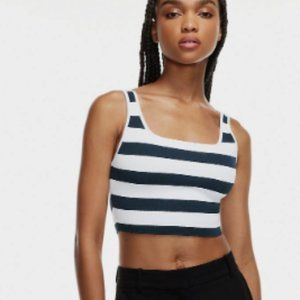 This is a square-neck tank top. Babaton’s signature sculpt-knit yarn smooths and contours your shape. This version comes in a yarn-dyed stripe.