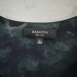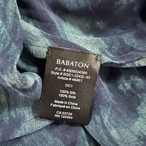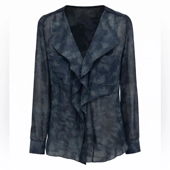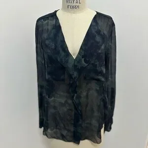 100% Silk blouse with cascading ruffles. Perfect for versatile styling. Sleeves roll up with a tab & button. Mix of navy and green design. Sheer.