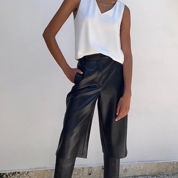 EUC vegan leather culottes from Aritiza. I loved these so much and they look super cool and relaxed on! Unfortunately too big now. Only worn a few times! I find these are a relaxed fit, between a 4 and a 6.