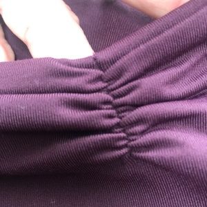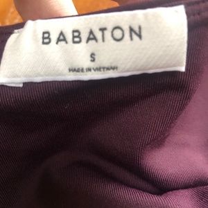Babaton long sleeve bodysuit, purple colour size small, new or like new. No tucking in with a bosy suit, clings to boys, nice front gather and long sleeves. Multi uses for a bodysuit, wear with short shorts, skirts, jeans dress pants, dress up or dress down, new or like new