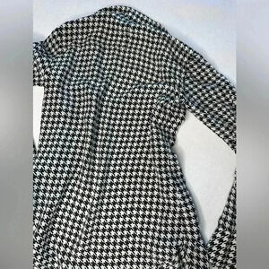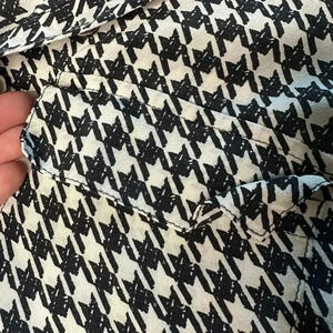 Houndstooth pattern. Has pockets on from on both sides (as shown). 100% silk. Machine washable on gentle. I’ve always washed on cold and always hung to dry.