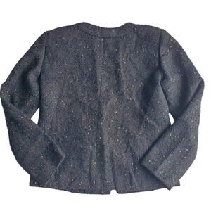 This is a clean, collarless tweed blazer. It's made from a speckled, textural fabric with a metallic thread.
