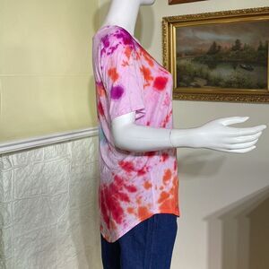 Beautiful silky-soft tie dye t-shirt from Babaton. Feminine deep round neckline, nice length, slightly lower at back and a colourful print, perfect for summer.