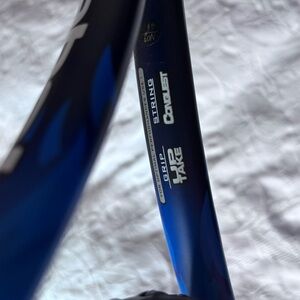 Sleek tennis racket in blue and black. Perfect for your next match.