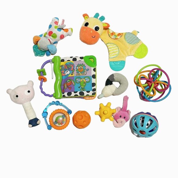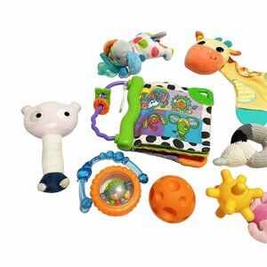 11 Piece Set of infant toys. Sensory winkle rattles and squishy texture balls. Soft cover book and chew toys. All EUC. Get them in your bundle with a cute outfit or two for an adorable closet discount!