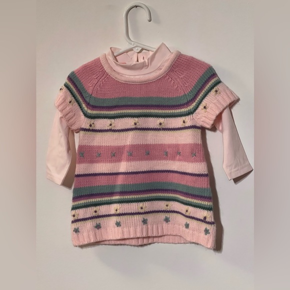 Brand new, the two pieces are still together and unworn. Cute little striped knit short sleeved sweater with a jersey pink long sleeve underneath.
