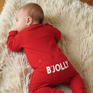 A classic holiday red long-sleeve thermal jumpsuit by baby B'gosh. The word "B'JOLLY" is printed in white across the rear flap which is non-functional but has decorative buttons.