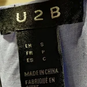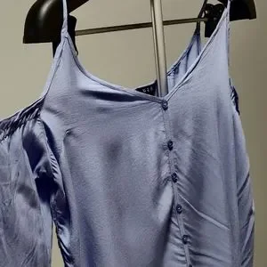 A baby blue top with adjustable spaghetti straps and tieing the sleeves on the shoulders.