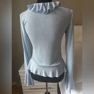 soft, feminine ruffle top in a pretty baby blue. stretchy + comfy fit. adorable peplum + flared sleeves. great condition ✨