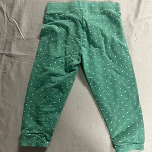 Charming green leggings with white polka dots. Features a cute red bow at the waist. Perfect for playful days.