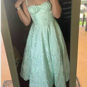 A dreamy blend of elegance and allure, the Amity Midi Dress in Mint is your perfect statement piece. Featuring a flattering mono-underwired balconette bust with a delicate lace trim. The lace-up back ensures a flawless fit, while the flowing full skirt brings effortless movement and charm.