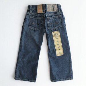 These are brand-new Polo Ralph Lauren jeans for boys, style Classic 867, size 2T. They are made from 100% cotton blue denim and have a classic five-pocket design with two front pockets, two back pockets, and a small coin pocket. The waistband is adjustable with buttoned tabs at the back for a comfortable fit. They have a button and zip closure at the front.