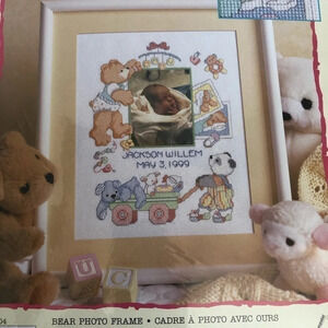 Kit to cross-stitch your own birth announcement frame which you can display your baby’s photo in!