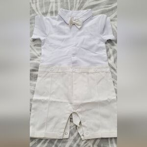 Adorable baby romper with a bow tie. Perfect for formal occasions. Short sleeves and button details.