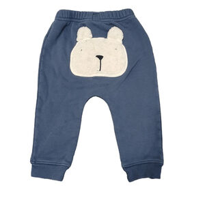 These are pre-owned baby Gap sweatpants in a blue color. They feature a white polar bear applique on the back. The sweatpants are made of a soft cotton blend and have an elastic waistband. Size 12-18 months. The sweatpants are in good condition with no visible tears or stains. The fabric is slightly faded, and there are some minor pilling on the fabric.