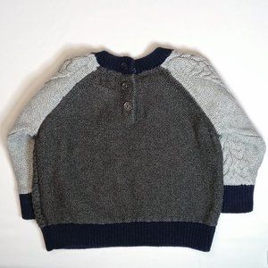 Baby Gap Gray and Navy colour block cable knit Sweater. It has a crewneck and a three button closure part way down the back.