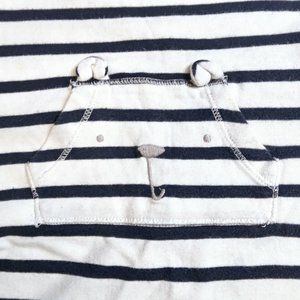 Baby Gap Navy and White Striped Footed Onesie, with snap closures at the crotch and legs.. It has a kangaroo pocket in centre front with little ears and embroidered animal face details.