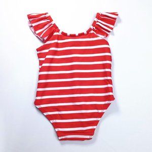 Baby Gap red and white striped swimsuit with ruffle sleeves.