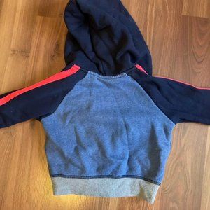 Baby Gap Zip Hoodie. Like new condition. Size 12-18Mos. Blue and grey with a neon orange strip down both arms. Heavy duty zipper.