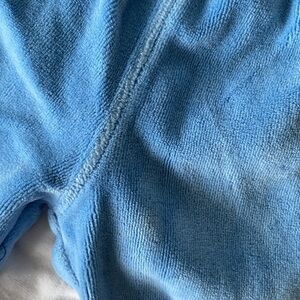 Baby Gap blue velour track suit matching set. Pants and full zip hoodie. Size 0-3 months. Tag says up to 3 months. So cute for an athletic look! Pair with baby sneakers. Has some slight staining. I've tried to picture. Wear present on velour. Was used for one baby. Blue and white.