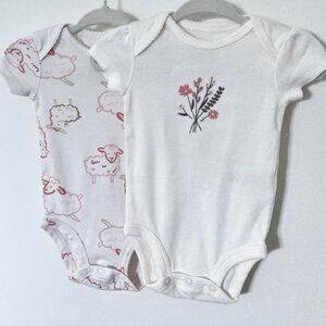 2x Carter's short sleeve bodysuits - white with floral embroidery, white with pink sheep - 100% cotton.