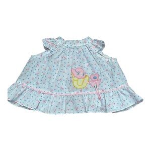 This little dress is playful and fun, with ruffle sleeves, a ruffle hem, ribbon front, bow tie back and cute embroidered duck.