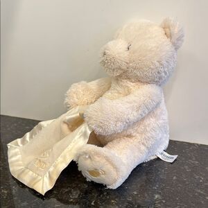 Baby Gund Peek-A-Boo Teddy Bear Plays Hide & Seek My First Bear Plush 11” Ivory . Adorable cream teddy bear holding a satin blanket. Perfect for cuddling. Working