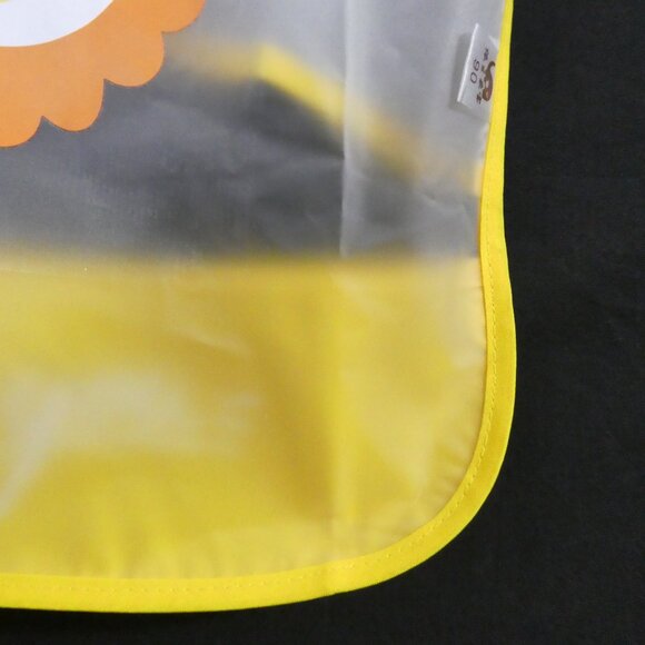 The bib is transparent with bright yellow edging, adding a pop of color while ensuring cleanliness during meals