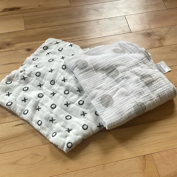 Two baby muslins Large Xo print is in like-new condition Small Polkadot is in EUC No staining Canadian company