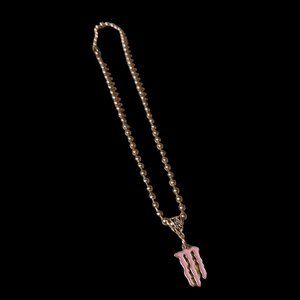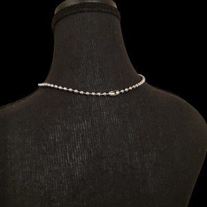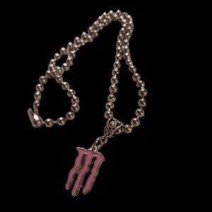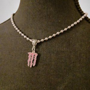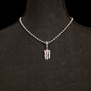 Brand-new, handcrafted stainless steel ball bead choker necklace, measuring 17" in length with 4mm ball beads. Adorned with a charming baby pink monster logo charm, approximately 1" long. This unique piece is perfect for those seeking a fresh, eye-catching accessory. New, unique and chic.