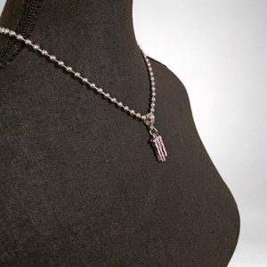 Hypoallergenic stainless steel 17" length. 4mm ball bead chain. Charm 1" baby pink enamel.